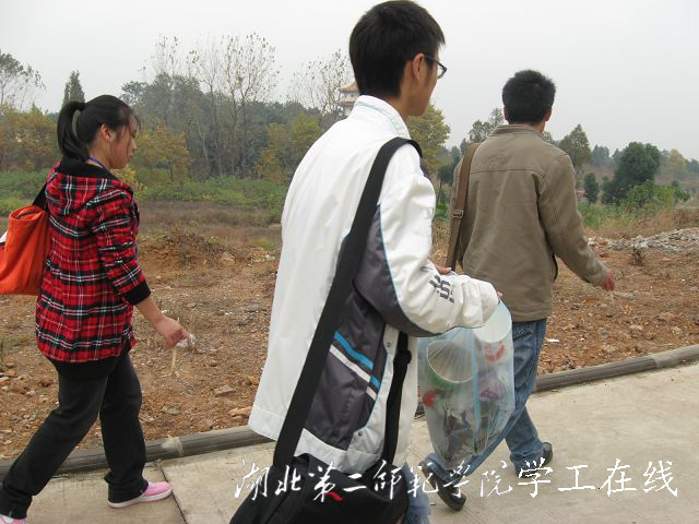 我们开展环保活动的场地,素以“勤”人坡和“情”人坡两种身份著称。勤奋的学生以这片草坪为学习的乐园,而情侣们以这片草坪为约会的天堂。于是,乐园和垃圾堆、天堂和地狱的距离只产生在举手投足之间。与其说这是一场清理垃圾的活动,还不如说这是一次心灵的洗涤。每一个生命都有它存在的理由和价值,它们以自己独特的方式存活着、绽放着。当我们看到肮脏的草坪被洁净和谐的乐园取代时,我们由心的微笑将会无比灿烂。