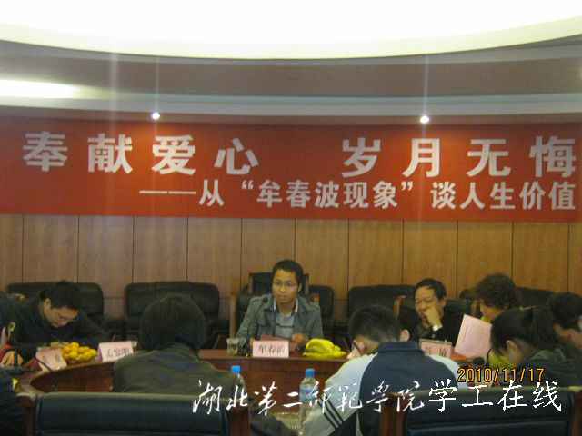 (记者 骆顺霞)11月17日下午14点30分,“奉献爱心,青春无悔,从牟春波现象谈人生价值”的交流会在行政楼二号会议室开展。出席此次会议的领导有彭敏、成新华、王志民、姚桂玲、熊进、吴建兵、李莎、黄欢、孟黎明、蒋作栋和各位辅导员老师以及学生代表。
