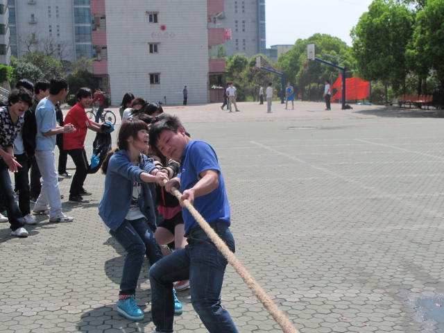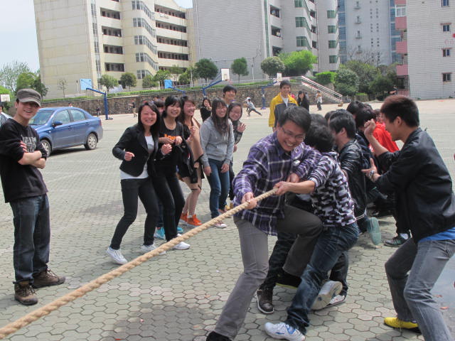 (本网讯《仰望》杂志社 计算机学院通讯员  袁娇燕)为了促进计算机学院应用技术专业学生之间的交流,增进班级同学们的凝聚力,培养团队协作精神,并积极响应计算机学院班级建设“八个一”工程和“十佳”特色团日活动,4月13日上午,10级计算机应用技术专业两个班的学生在10号楼前举行了激烈的拔河比赛。计算机学院辅导员熊军平、张锐老师也参加了本次活动,熊老师担任裁判。