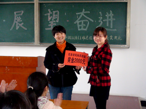 学工部副部长陈慧敏为文学院2010级汉语言文学(1)班颁发“优良学风标兵班级”奖金