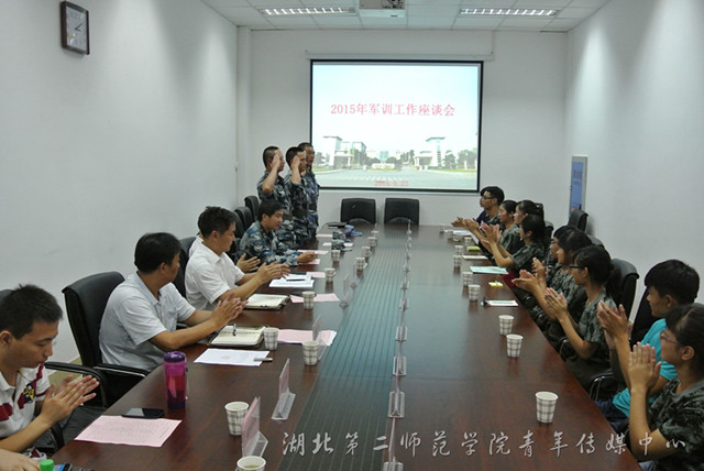 本网讯(青媒记者 韩文静)2015年9月23日下午,我校2015年军训工作座谈会在阳光家园会议室举行。副校长黄颂、学工部部长刘儒国、副部长施旭、教官代表以及各学院辅导员、学生代表参加了会议。