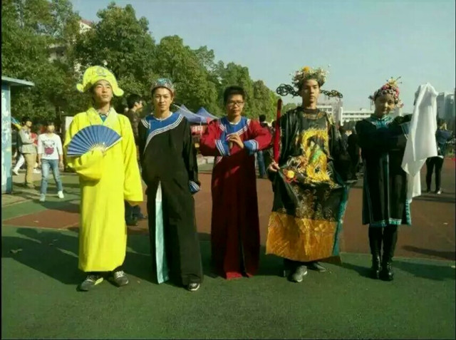 “这个创意是文学院学生会的文艺部想出来的。”扮演旦角的马兵林为我们介绍道。据了解,这次方阵表演主要是为了展现文学院的文学气息,发扬传统文化。