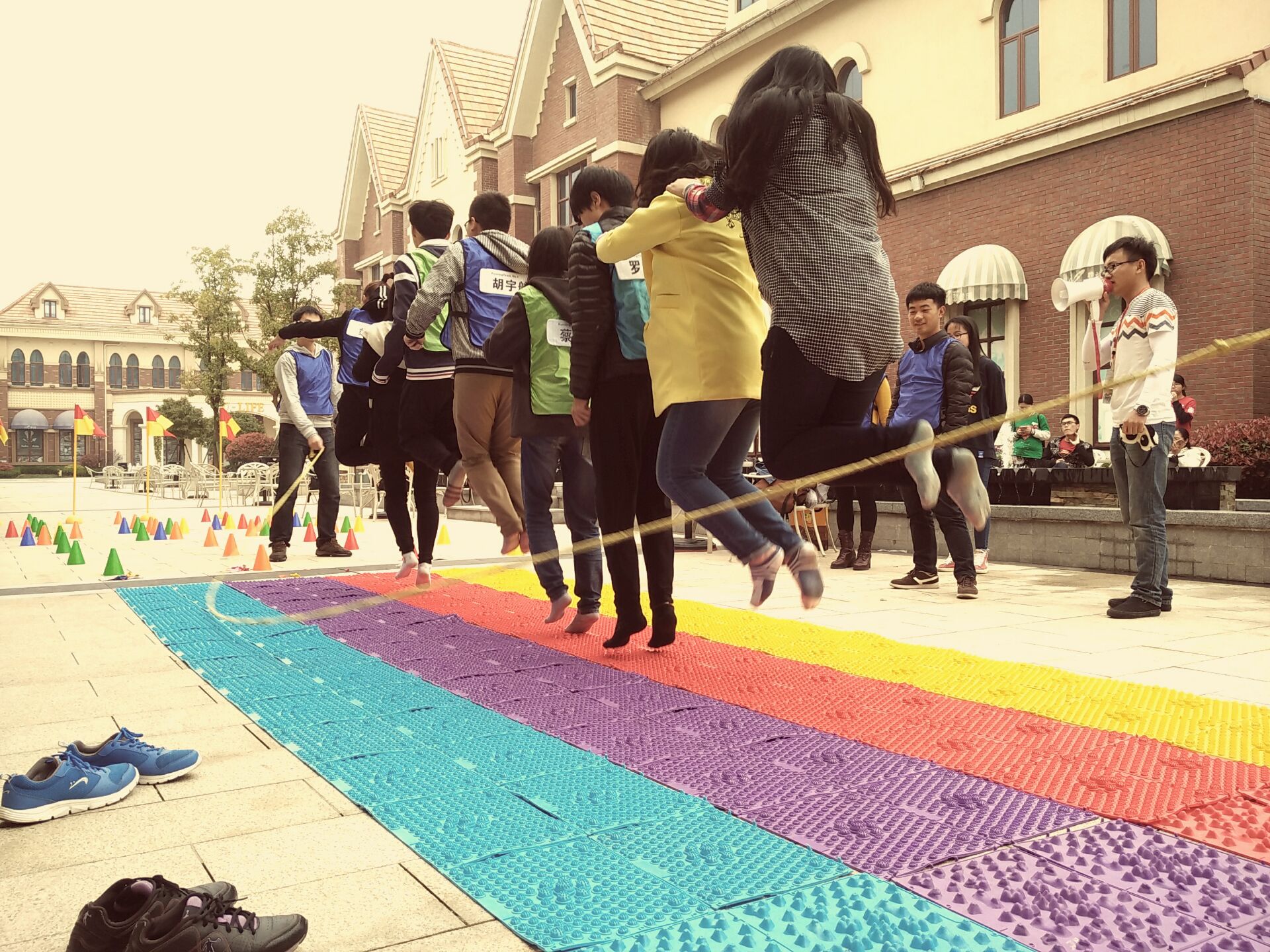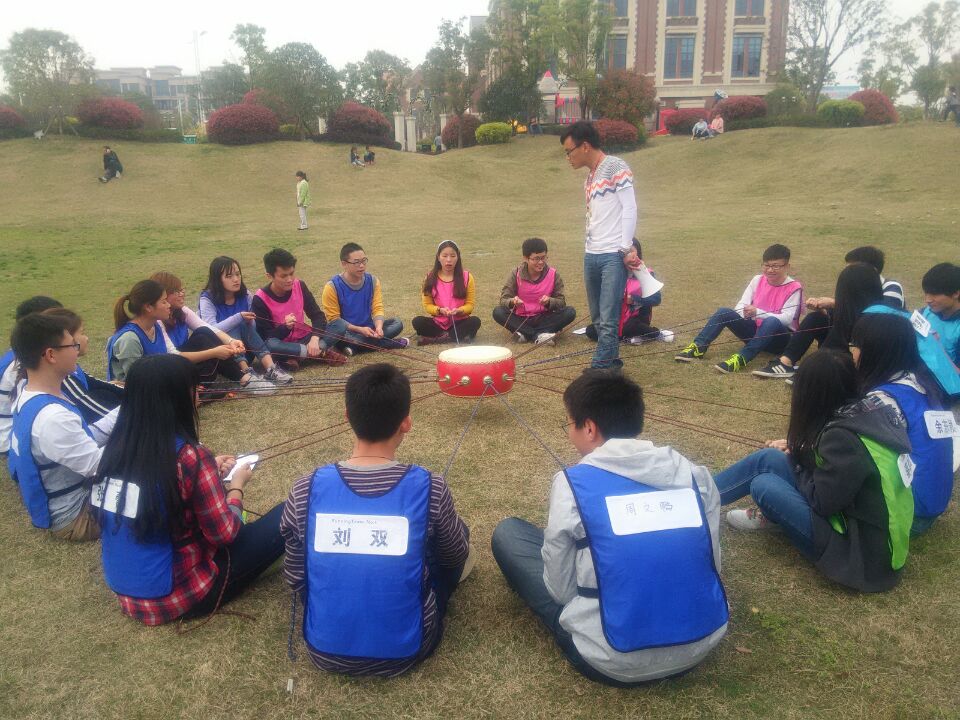 在素质拓展过程中,中心成员团结合作,齐心协力完成了花开花落垒长城、极速60秒、鼓动人心、撕名牌,趾压板等各项游戏项目挑战。在玩鼓动人心游戏时,成员们一人拿着一根绳,把鼓拉起放下托起网球,刚开始只能托起一两次,经过成员的努力,同心齐力最终完成了20次的挑战。在撕名牌游戏中,成员们分组PK,组与组之间建立联盟合理竞争,组员开拓创新把握全局,玩了一轮又玩一轮,虽然很累但是兴趣未尽。