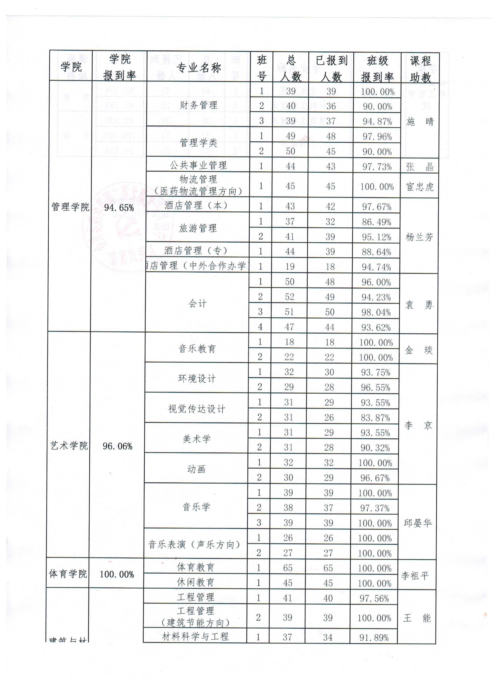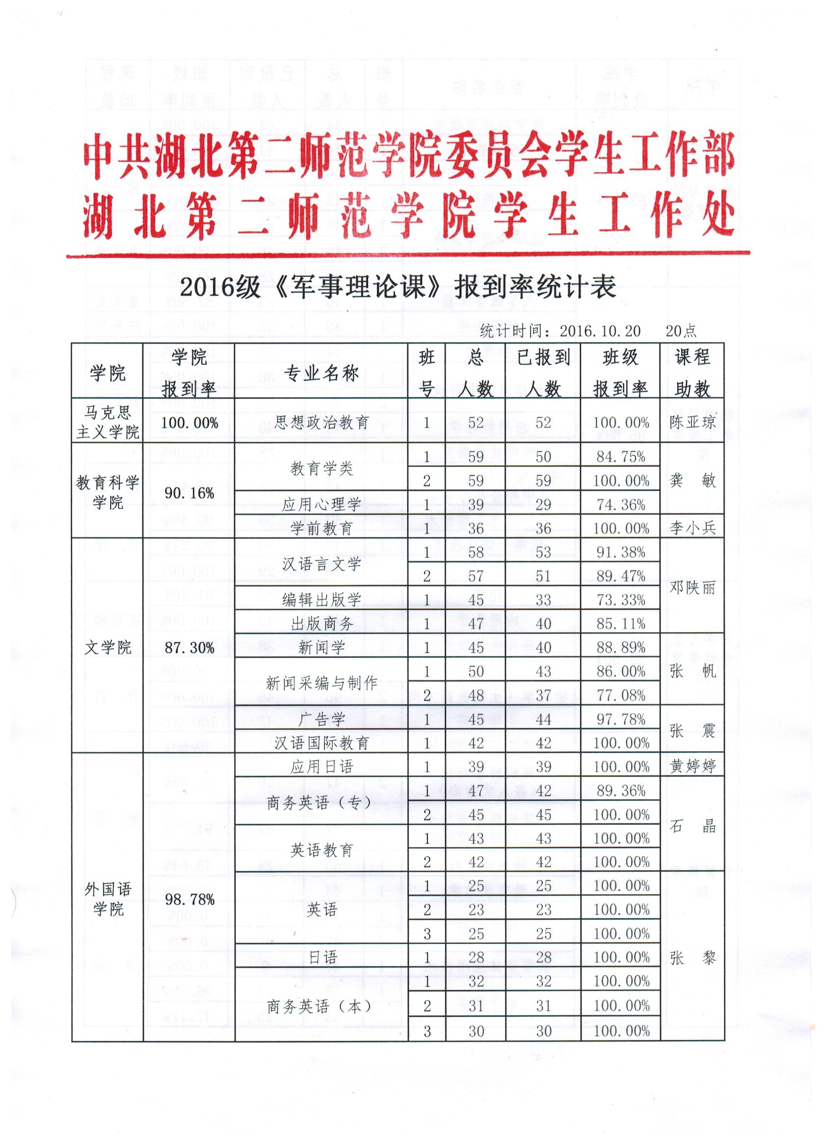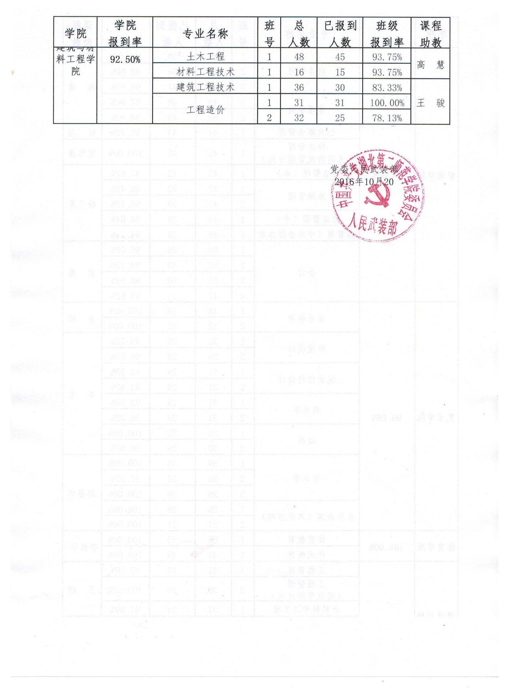 2016级《军事理论课》报到率统计表(2016.10.20)