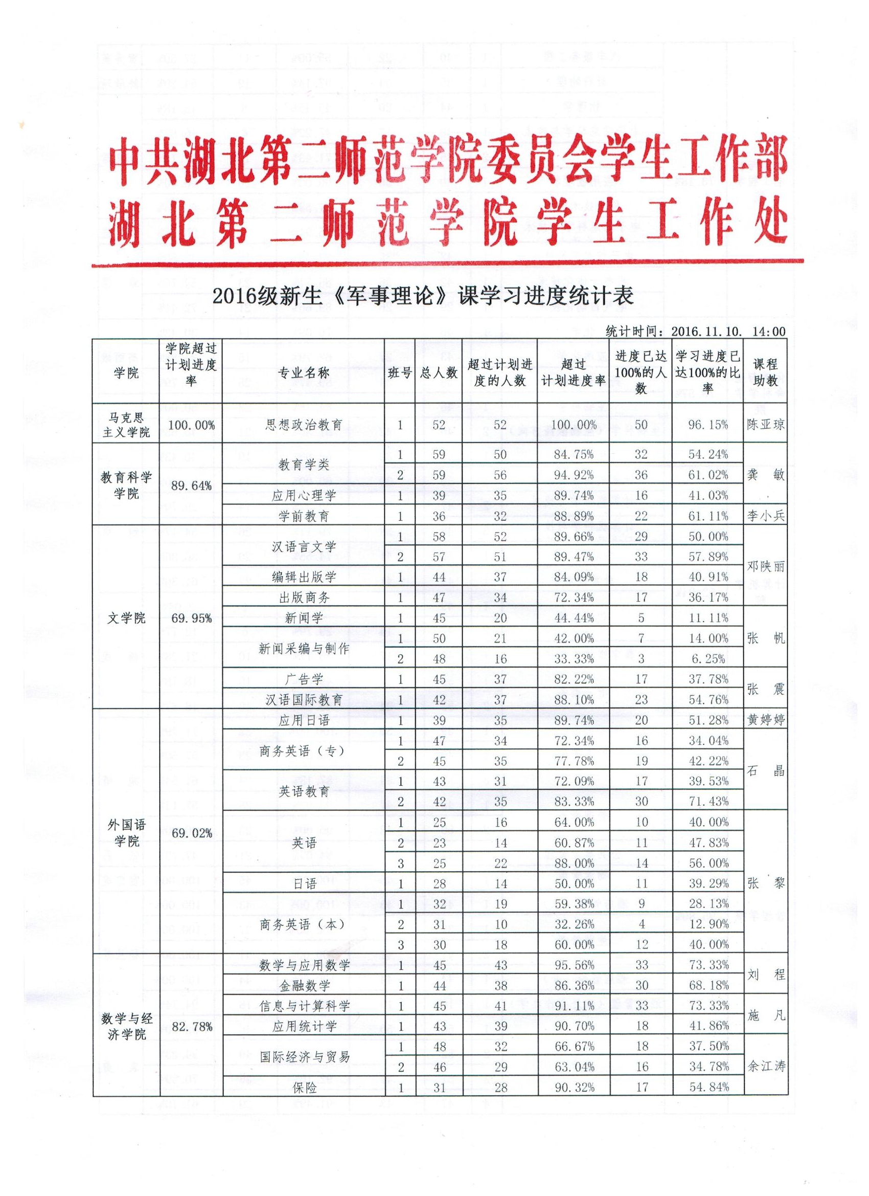 2016级《军事理论课》学习进度统计表(2016.11.10)