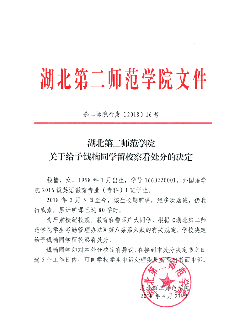 湖北第二师范学院关于给予钱楠同学留校察看处分的决定