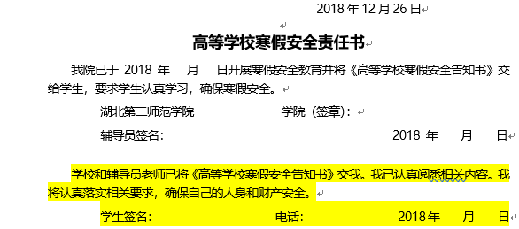 为切实做好寒假阶段大学生安全教育工作,现组织我校全体学生签订《高等学校寒假安全告知书》、《高等学校寒假安全责任书》。具体要求如下: