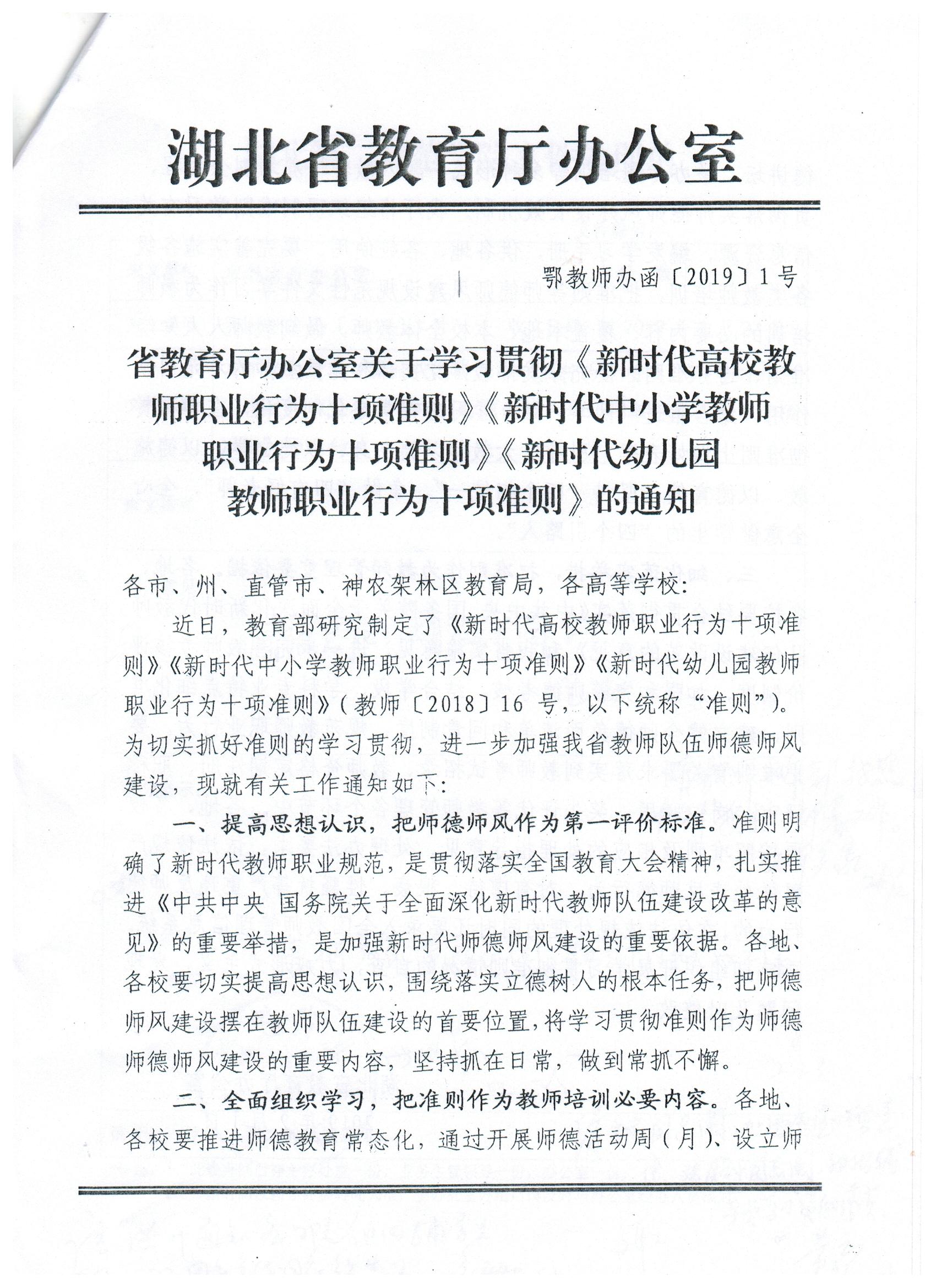 2.省教育厅办公室关于学习贯彻《新时代高校教师职业行为十项准则》《新时代中小学教师职业行为十项准则》《新时代幼儿园教师职业行为十项准则》的通知