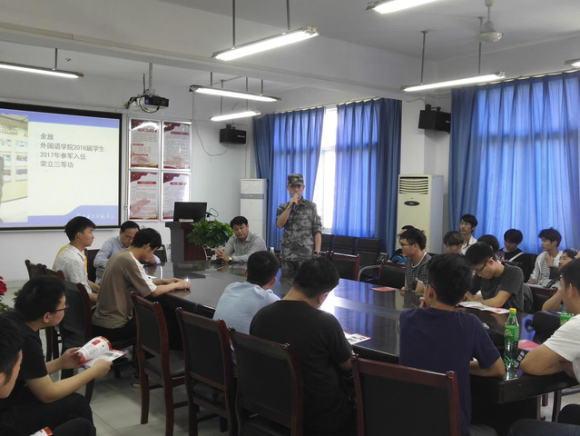 接下来,现役军人余放同志分享了自己参军的经历与心得。余放同志为我校外国语学院2018届学生,2017年积极响应国家号召应征入伍,在部队服役期间荣获三等功。