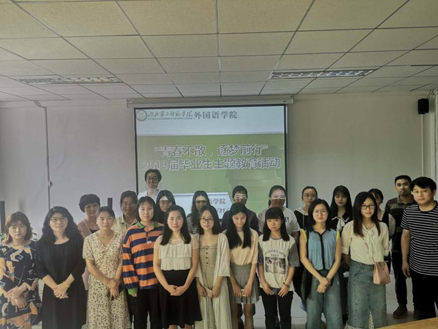 本网迅(通讯员 谭薇 胡亚薇)2019年5月31日中午1点,外国语学院在3号教学楼2楼多功能厅开展“青春不散,逐梦前行”2019届毕业生主题教育活动。外国语学院党总支书记彭敏、党总支副书记吴少明出席,2019届毕业生代表40人及辅导员代表与会。会议由石晶老师主持。