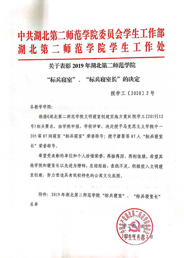 关于表彰2019年湖北第二师范学院 “标兵寝室”、“标兵寝室长”的决定