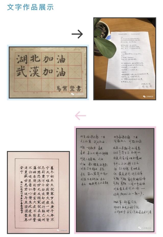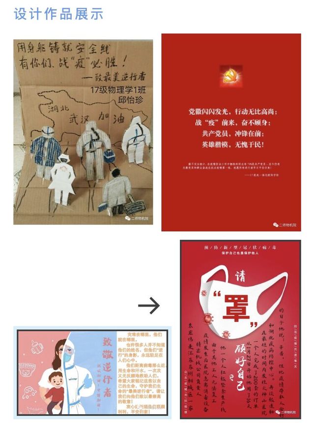 物机学院推出了“纸短情长,为你而作——物机学子为逆行者献祝福”线上宣传作品征集活动。活动一上线便广受同学们的欢迎,党员、入党积极分子、高年级学生广泛参与,截止22日共收到74个作品。一首首诗句,一幅幅画作,一帧帧的情意表达出他们的致敬,同时也诠释出在疫情面前物机学子蓬勃向上的正能量。