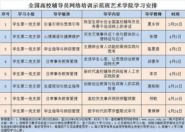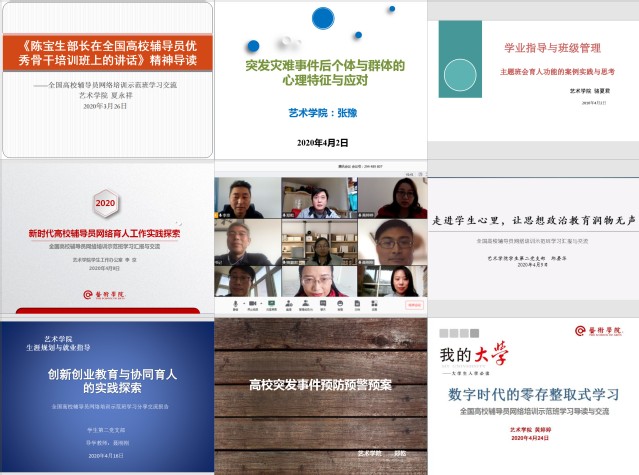 3月22日,学校转发了教育部思想政治工作司《关于举办全国高校辅导员网络培训示范班的通知》。当天下午,艺术学院学工团队召开学生工作网络视频会议,总结了近期学生工作的开展情况,并对全国高校辅导员网络培训示范班的学习进行了工作部署,制定了分组学习计划和重点课程导学讨论安排。分党委副书记夏永祥对前期各位辅导员的工作作出充分肯定,并对示范班的学习提出了要求,主动承担了示范班第一课的导学任务。