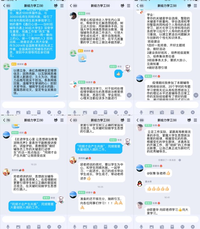最后,学工老师纷纷表示,在疫情防控期间学习学生工作的业务理论及防疫相关知识是非常有必要的。大家可以静下心来,对自己工作查漏补缺,通过对专家讲座的认真研读和在线答疑互动,共同探讨在疫情期间以及日常工作中遇到的各类问题,提高业务素养,加强自身知识储备,为今后学生工作的开展奠定坚实的理论基础。