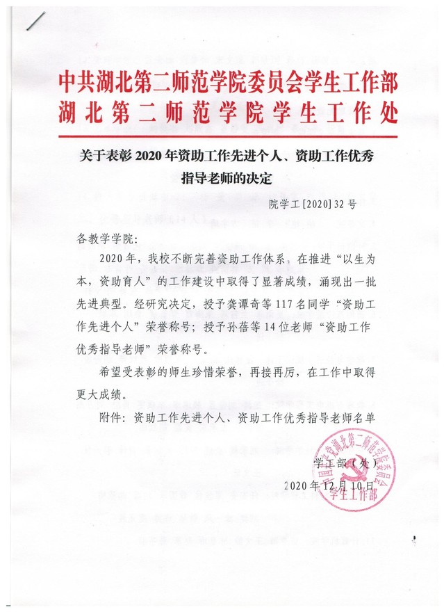 关于表彰2020年资助工作先进个人、资助工作优秀指导老师的决定