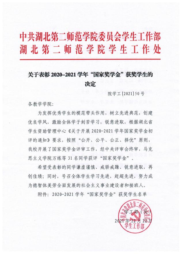 关于表彰2020-2021学年“国家奖学金”获奖学生的决定
