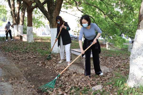 在马克思主义学院门前的勤人坡,黄颂与师生们一起清扫路面、拾捡垃圾、铲除杂草。