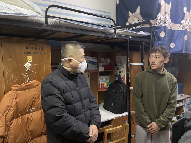本网讯(通讯员 谢远洋 涂雅兰 张灏)2023年2月19日上午,校党委常委周忠、“师友·学友行动”联系单位招生就业处处长刘儒国、图书馆馆长彭敏及学院全体领导班子成员走访学生宿舍,看望慰问返校学生及部分新生家长,向同学们表达了学校和学院的关心和问候,详细询问了学生返校及生活学习情况,并鼓励同学们在新学期做好人生规划,学好专业知识,努力提升自己。