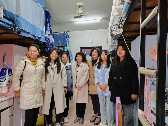 化生学院党委书记严莉萍带队走访西九女生宿舍。在走访过程中,严莉萍对2022级学生寝室的卫生状况提出表扬,鼓励同学们进行宿舍多样化文化氛围建设,强调要保持宿舍卫生,勤通风,多通风,共同创造一个良好的生活与学习环境。彭敏馆长向同学们介绍了图书馆丰富的馆藏以及与专业相关的电子资源如何查询等,鼓励同学们多走出宿舍、走进图书馆,感受浓厚的学习氛围。