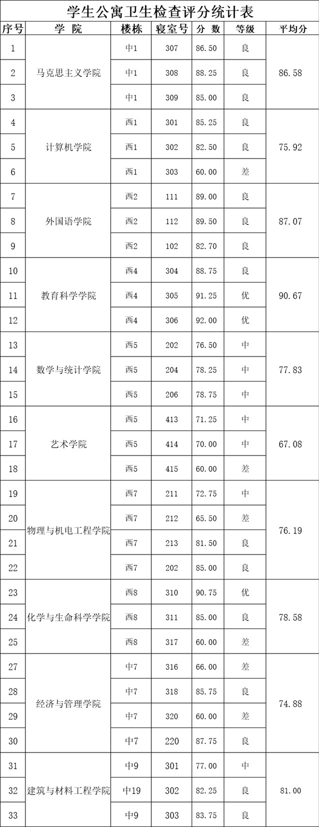 为深入学习贯彻习近平总书记关于深入开展爱国卫生运动的重要指示精神,结合《湖北第二师范学院加强新时代劳动教育工作实施方案》的要求,持续推进“洁净校园”行动,健全文明寝室建设长效机制,学校于4月27日下午组织开展了第三次寝室卫生检查,现将情况通报如下: