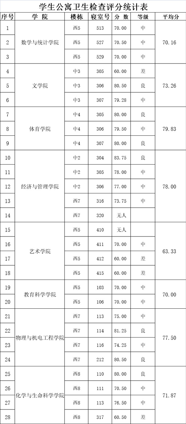 为深入学习贯彻习近平总书记关于深入开展爱国卫生运动的重要指示精神,结合《湖北第二师范学院加强新时代劳动教育工作实施方案》的要求,持续推进“洁净校园”行动,健全文明寝室建设长效机制,学校于5月11日下午组织开展了第四次寝室卫生检查,现将情况通报如下: