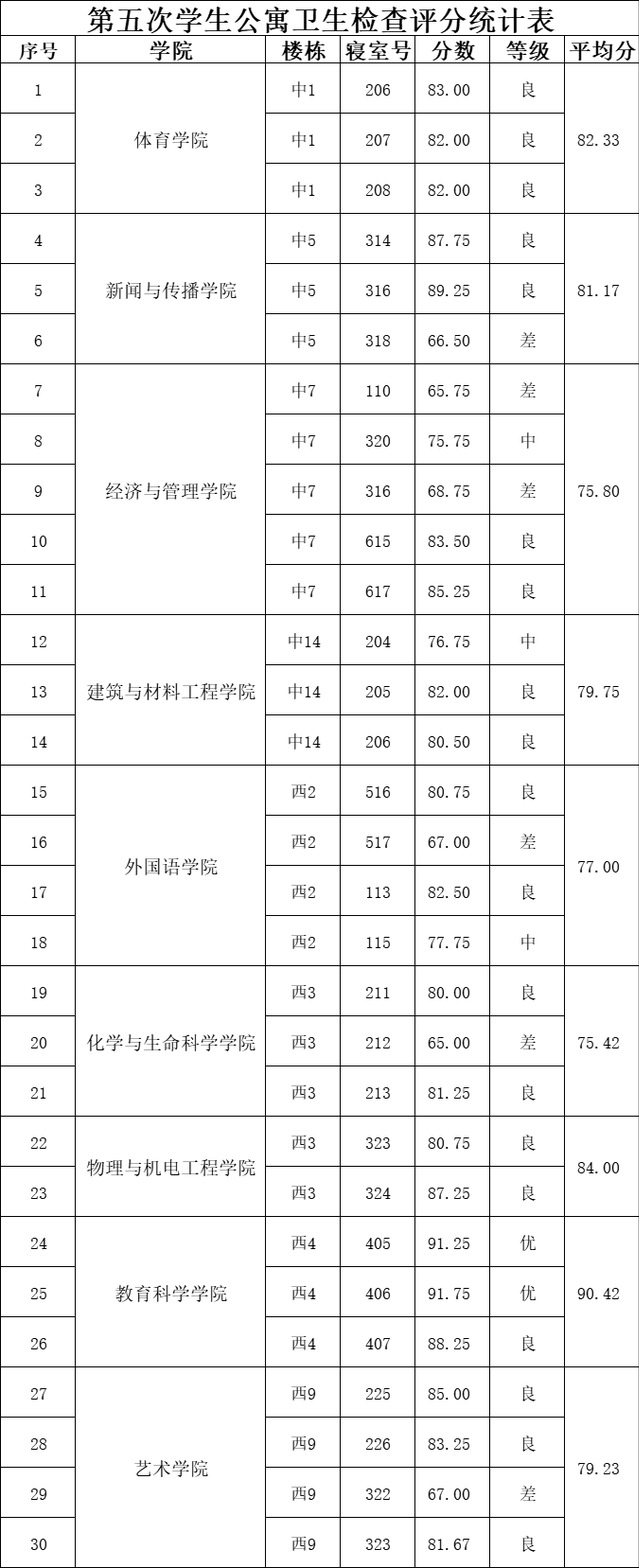 为深入学习贯彻习近平总书记关于深入开展爱国卫生运动的重要指示精神,结合《湖北第二师范学院加强新时代劳动教育工作实施方案》的要求,持续推进“洁净校园”行动,健全文明寝室建设长效机制,学校于5月25日下午组织开展了第五次寝室卫生检查,现将情况通报如下: