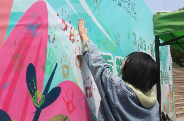 3月30日于图书馆前广场开展线下游园活动,活动现在吸引众多同学驻足、体验。在“青春手印”活动中,参与的同学可自由选择颜料涂抹在手上,将手印留在展板上或明信片上,并附以青春留言,用缤纷的色彩书写着希望与活力。同学们还可与“皮卡丘”以及“熊本熊”两个超人气玩偶亲密互动,通过拥抱感受温暖与支持。