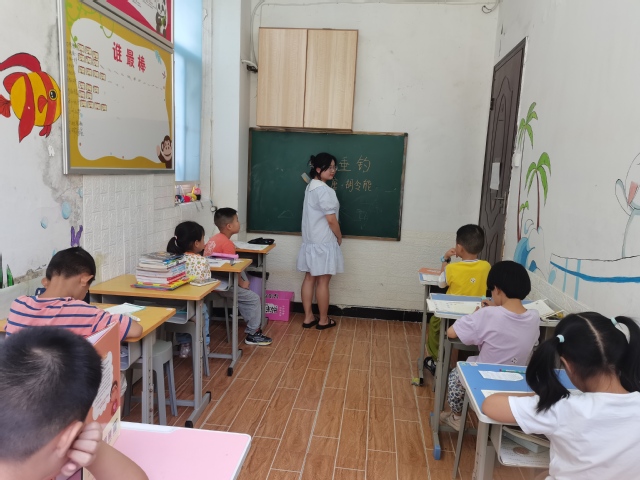 这是一个位于小区里面的幼儿园,她姐姐因为就在幼儿园工作,所以为了暑期帮助小区居民解决孩子们暑期无人照顾的困难,姐姐带着她一起就在这吃住,管着8个孩子,孩子们在这里午休,在这里学习和吃饭。姐姐在厨房为孩子们的午饭做准备,她带着我走向教室。在她工作时候打扰她我有点不好意思,她马上看出了我的迟疑,她跟我说,老师没事,这些孩子们都很可爱,看见你来都会很高兴的!我跟着她走进了教室,坐在最后一排看她给学生讲授《小儿垂钓》,我被她自信阳光的样子深深地吸引了,这和她平时在学校的样子完全不一样。