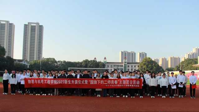 本网讯(通讯员 沈子颖)10月23日上午7:00,物理与机电工程学院(以下简称“物机学院”)在田径运动场国旗台举办2023级新生升旗仪式暨“国旗下的二师青春”主题团日活动。物机学院领导班子、各系主任、2023级新生班级班主任、全体辅导员、教师代表及学生代表参加此次活动。