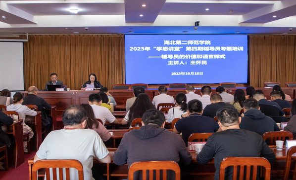 本网讯(学通社记者 刘子蕾)10月18日上午,我校在行政楼五号会议室举行“学思讲堂”第四期辅导员专题培训,邀请武汉大学新闻与传播学院党委副书记王怀民作《辅导员的价值与语言样式》专题辅导,学生工作部副部长张敏主持会议。