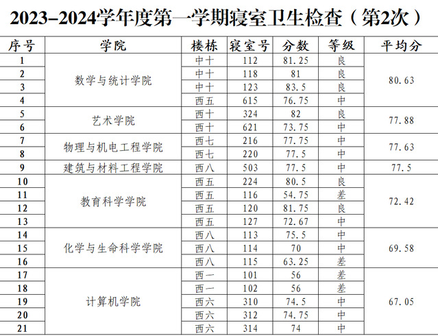 为深入学习贯彻习近平总书记关于深入开展爱国卫生运动的重要指示精神,结合《湖北第二师范学院加强新时代劳动教育工作实施方案》的要求,持续推进“洁净校园”行动,健全文明寝室建设长效机制,学校于11月2日下午组织开展了第二次寝室卫生检查,现将情况通报如下: