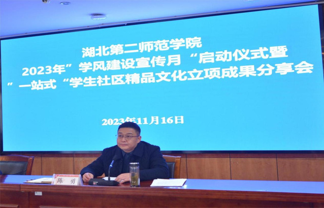 本网讯 (通讯员 李雅嘒) 11月16日下午,我校2023年“学风建设月”启动仪式暨“一站式”学生社区精品文化立项成果分享会议在行政楼5号会议室举行。校党委书记杨鲜兰出席本次会议,学校相关职能部门负责人、学院党委(党总支)书记或院长、副书记、副院长、学工办主任、全体辅导员及学生代表参加会议,会议由校党委常委、副校长陈勇主持。