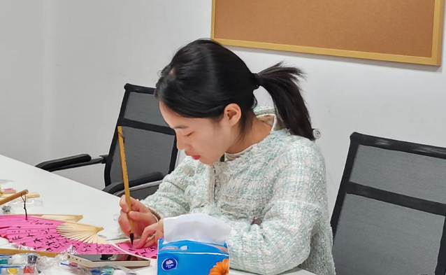 活动伊始,赵思宇向各班参赛选手分发毛笔、颜料、书法扇子、钢笔等工具。紧接着,参赛选手依据自己所选择的篇目全神贯注地书写诗词。参赛选手有的写着婉约秀美的钢笔字,有的写着行云流水的毛笔字,充分展现了书法艺术的魅力。同学们表示,“一站式”学生社区丰富了他们的“第二课堂”,是他们思维交流的文化阵地。最后,赵思宇、曾诗收集本次活动的扇面书法作品,后期将评选优秀作品,颁发奖状,并将扇面书法作品展出。