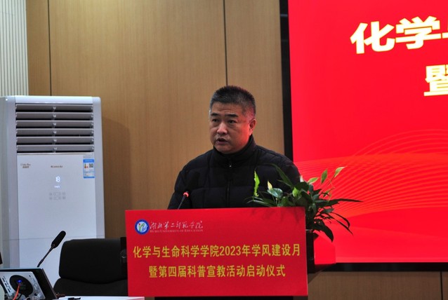 本网讯 (通讯员 彭盼 杨舒婷 张灏)11月30号下午,我校化学与生命科学学院(以下简称“化生学院”)2023年学风建设月暨第四届科普宣教活动启动仪式于S6201顺利举行。校党委常委、副校长陈勇,校党委常委、宣传部部长周忠出席。化生学院党委副书记雷晓林主持本次会议。