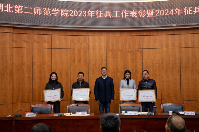 会上表彰了艺术学院、教育科学学院、外国语学院、体育学院等4个“征兵工作先进单位”,樊勇等12名“征兵工作先进个人”和潘思远等8名“征兵工作优秀宣讲员”;聘任俞天阳等5名退役大学生士兵为学校征兵工作宣讲员;先进单位代表、教育科学学院党委书记乐三明作征兵工作经验交流;征兵工作校级宣讲员代表、退役大学生士兵、经济与管理学院23级酒店管理俞天阳同学作表态发言。