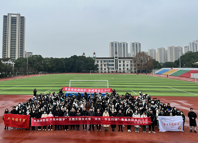 本网讯(通讯员 谢莹)12月12日7时,外国语学院在田径场举行了“永远跟党走,共筑中国梦”主题升旗仪式。两训中心主任王勇、国际交流处伍晓飞、外国语学院党政班子、全体辅导员以及学生代表参加了升旗仪式。2023级英语2班许生亮担任主持人。
