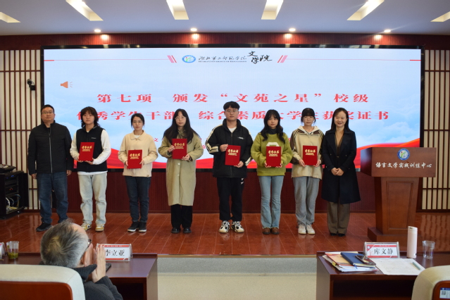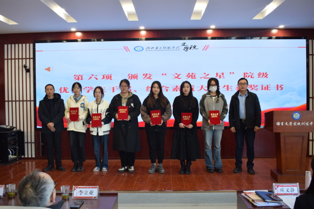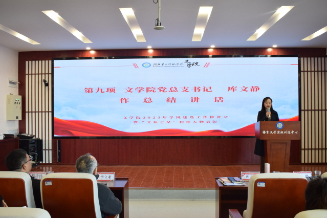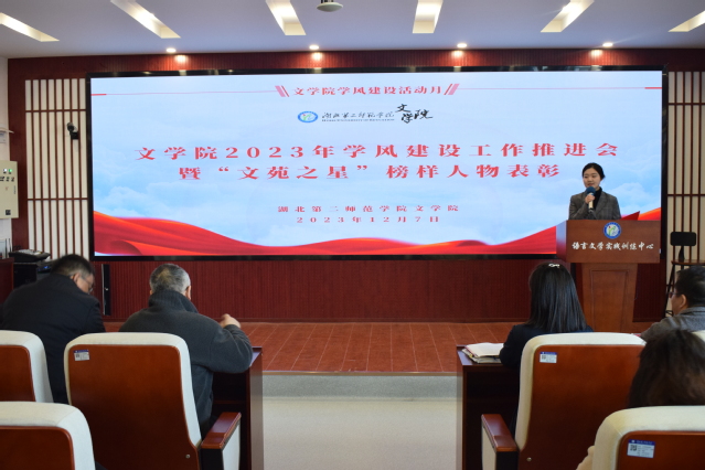 本网讯(通讯员 梅雅倩)12月7日下午,文学院召开2023年学风建设工作推进会暨“文苑之星”榜样人物表彰大会。师友单位校保卫处副处长熊寅墨,师友单位校发展规划处处长李立亚、副处长黎建锋,文学院党总支书记库文静、党总支副书记胡鹏、副院长李汉桥出席,文学院全体教职工以及各班学生代表参加。