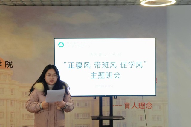 本网讯(通讯员吴梦谊)为了进一步加强学风建设,培育优良学风,优化育人环境,营造良好的学习氛围,12月5日中午,新闻与传播学院(以下简称“新传院”)在中区五栋宿舍楼新传书院开展“正寝风 带班风 促学风”主题班会。学工办主任孙蓓、辅导员邵鑫宇主持班会,新传院各班班长、学习委员和寝室长参加此次班会。