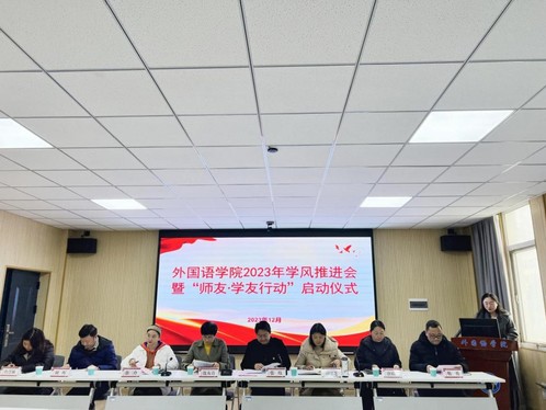 本网讯(通讯员刘佳睿)12月12日下午,外国语学院在学院3楼会议室举行2023年学风建设推进会暨“师友·学友行动”启动仪式。外国语学院“师友·学友行动”联系单位国际交流与合作处、学科建设办公室(研究生处)、两训中心相关负责人,学院班子成员、辅导员及学生代表参加活动。仪式由钱晓琳老师主持。