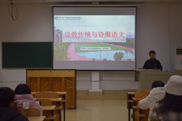 石伟华先从职业规划角度分析汉语言文学师范生在日后就业面试、教育教学中面临的问题,引起同学们对自己生涯规划的思考。由此引出了他今天所讲的主题——“诗教传统与诗维语文”。