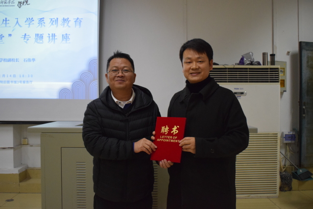 讲座伊始,胡鹏为石伟华颁发文学院“敬文师苑”一站式学生社区服务驿站社区导师聘书。