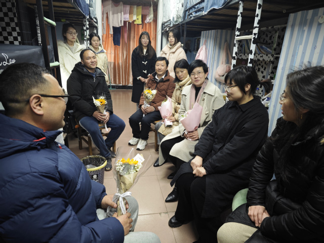 随后,领导老师们一行到“一站式”学生社区慰问困难学生,围绕学生家庭情况、学习生活亲切交谈。大家关切询问学生家庭是否遭受暴雪、冻雨等极端天气影响,勉励同学们要刻苦学习,保持积极乐观心态,迅速调整生活作息,以饱满的精神状态投入新学期。同时,激励同学们要抓住发展机遇,做好新学期学习规划,学好专业知识,提升自身能力,以积极的态度、崭新的面貌投入到新学期的学习与生活去;锤炼过硬本领,争做有理想、敢担当、能吃苦、肯奋斗的新时代好青年,为国攀登!