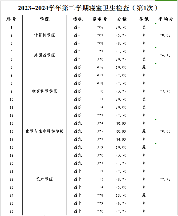 为深入学习贯彻习近平总书记关于深入开展爱国卫生运动的重要指示精神,结合《湖北第二师范学院加强新时代劳动教育工作实施方案》的要求,持续推进“洁净校园”行动,健全文明寝室建设长效机制,学校于4月11日下午组织开展了第一次文明寝室创建检查,现将情况通报如下: