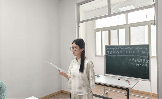 本网讯(通讯员 姚颖)为进一步激发同学们对诗词的热爱,弘扬优秀传统文化,提高同学们的文学素养,4月18日14时,数学与统计学院在中区十栋“一站式”学生社区举行2024年“读书文化节”系列活动之读书分享会第二期“吟诗听风雅,词韵染人间”诗歌朗诵比赛。数学与统计学院团委学生副书记肖述洋,主席团成员傅国华,2023级各班参赛选手参与本次活动。活动由2023级应用与统计学1班韩欣乐主持。