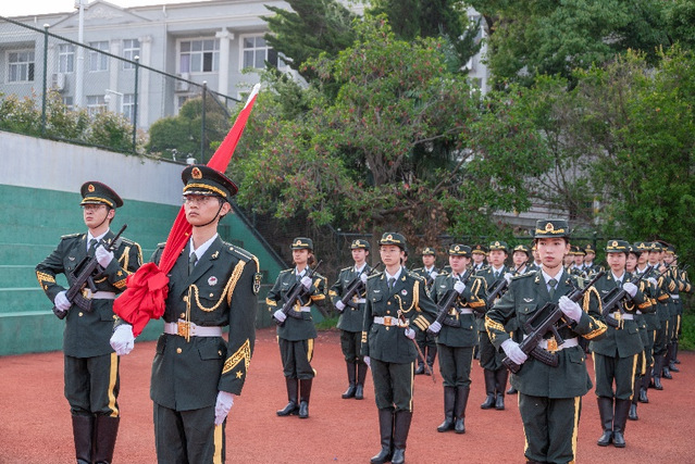 迎着朝阳,国旗护卫队成员踏着整齐划一、铿锵有力的步伐走向升旗台,国歌奏响,全场师生齐唱国歌,在激昂的歌声中,五星红旗冉冉升起。