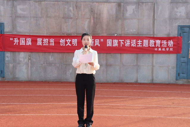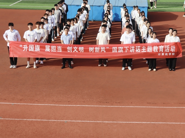 本网讯(通讯员 刘高其)为深入学习宣传贯彻习近平总书记五四青年节对全国广大青年寄语精神,5月13日上午7时,计算机学院在田径场国旗台前开展“升国旗 展担当 创文明 树新风”国旗下讲话主题教育活动。学院第24 期入党积极分子、第24期入团发展对象及分团委学生会骨干参加,学院学生会主席团成员亢心玥主持活动。