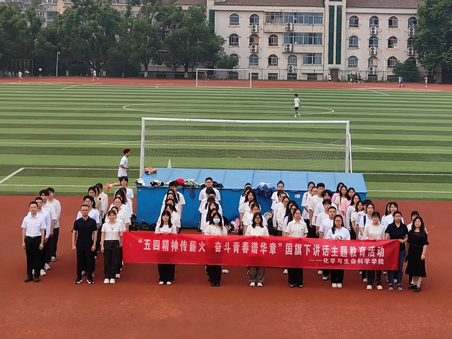 本网讯(通讯员 吴重阳)为激发师生爱国热情,强化新时代青年的使命担当,5月20日,化学与生命科学学院在学校综合田径场举行了“五四精神传薪火,奋斗青春谱华章”升国旗主题教育活动,学院党委副书记雷晓林、学生工作办公室主任孙晨、全体辅导员、预备党员及发展对象参与活动,学生党员焦瑜晨作主持。