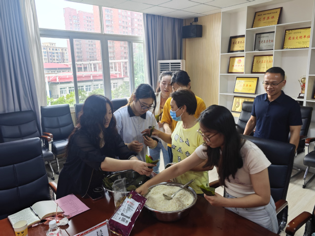研讨交流结束后,与会教师和学生参与端午包粽子实践活动,捋叶、灌米、捏紧、压实、成型、缠线……体验包粽子的劳动乐趣,现场充满活力与快乐。