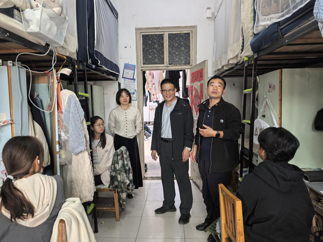 本网讯(通讯员 余淅 姜美舞)10月31日下午,为深入了解2024级新生基本情况和思想动态,帮助他们尽快融入新环境,适应新生活,学院“师友•学友行动”联系单位基建处处长邢宽广、副处长刘玉祥深入学院“一站式”学生社区走访联系寝室。党委副书记陈凌云、“一站式”学生社区学业导师聂琼、新生辅导员李扬陪同全程参加。