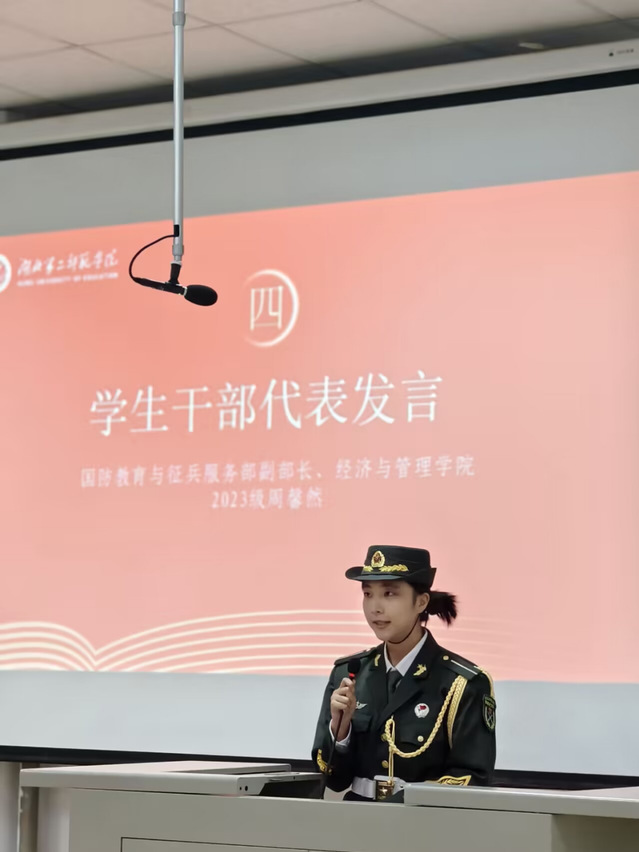 大学生事务服务中心第三届学生干部代表、国防教育与征兵服务部副部长、经济与管理学院2023级周馨然发言。她表示,站在新的发展起点,第三届学生干部们会继续努力,为学生工作的辉煌未来而奋斗。